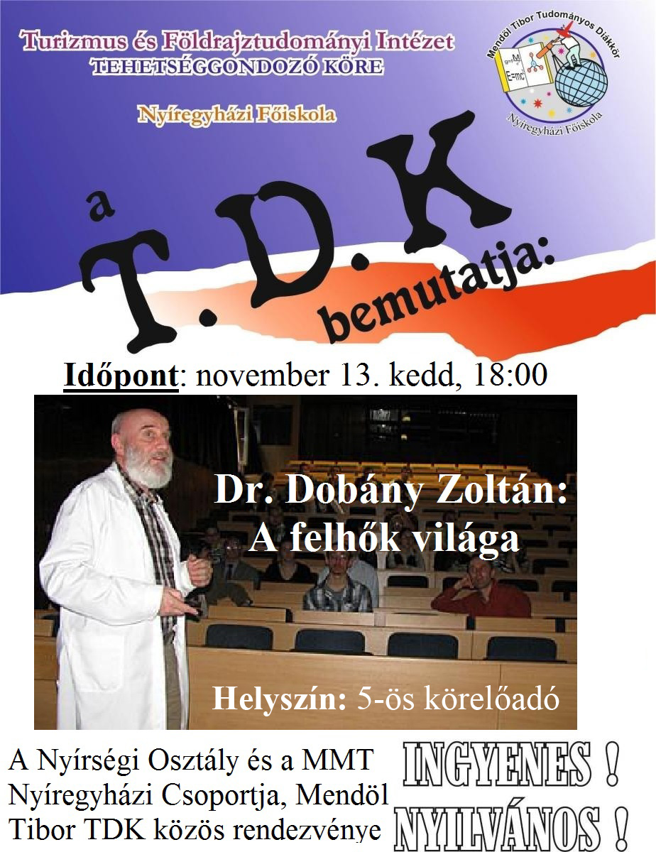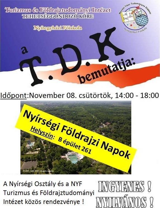 Az MMT Nyíregyházi Csoportja, az MFT Nyírségi Osztálya és a Nyíregyházi Főiskola Mendöl Tibor Tudományos Diákköre tisztelettel meghív minden érdeklődő hallgatót... (tovább>>)