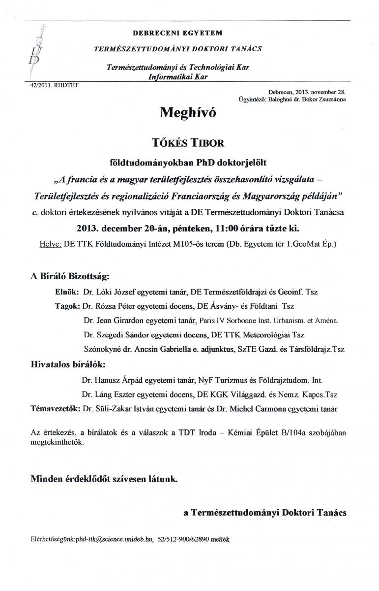 Meghívó, Tőkés Tibor doktori értekezésének vitájára